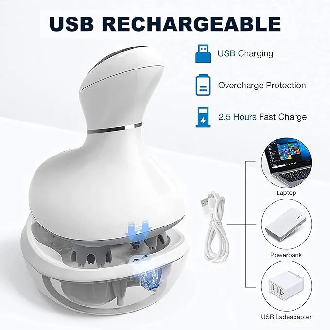 Say goodbye to tension and stress with this Electric Scalp & Body Massager! Its ergonomic dome-shaped design and rotating silicone nodes gently knead away fatigue while stimulating blood circulation — perfect for scalp, neck, shoulders, and even legs.